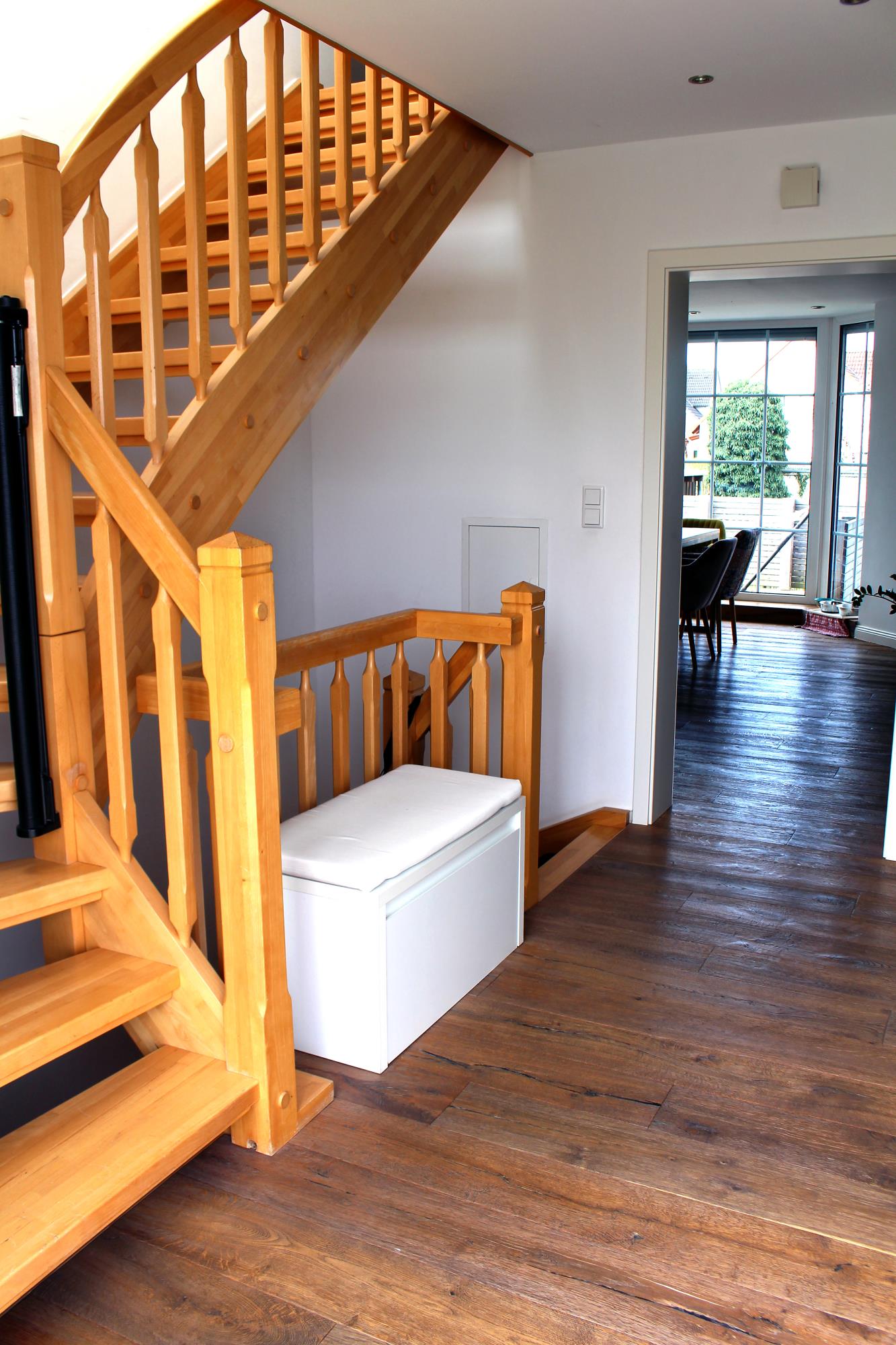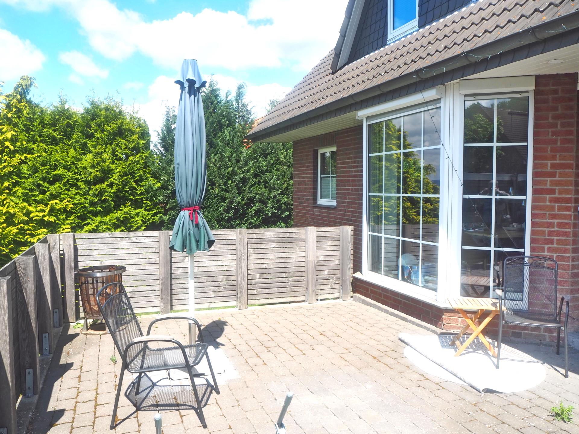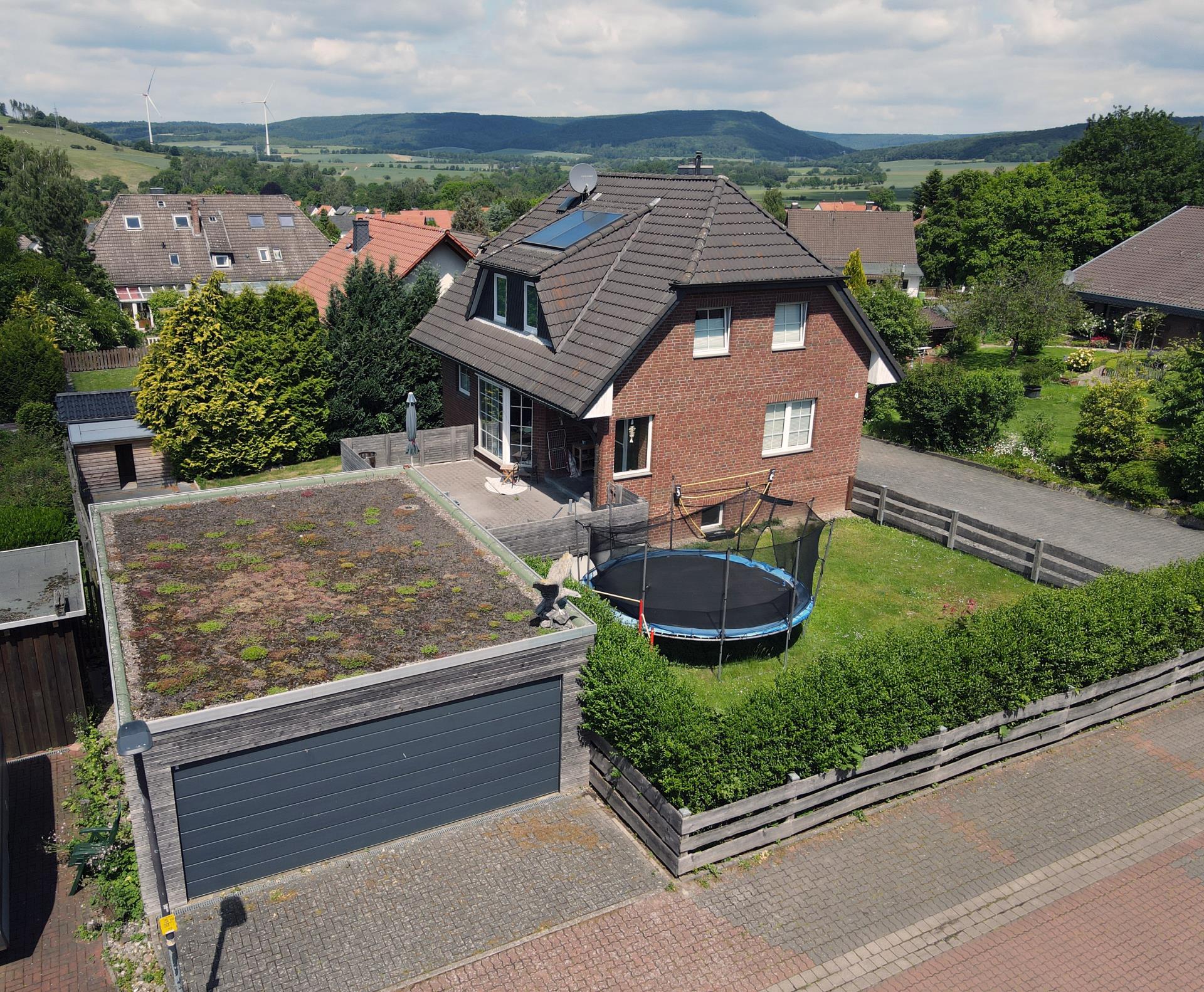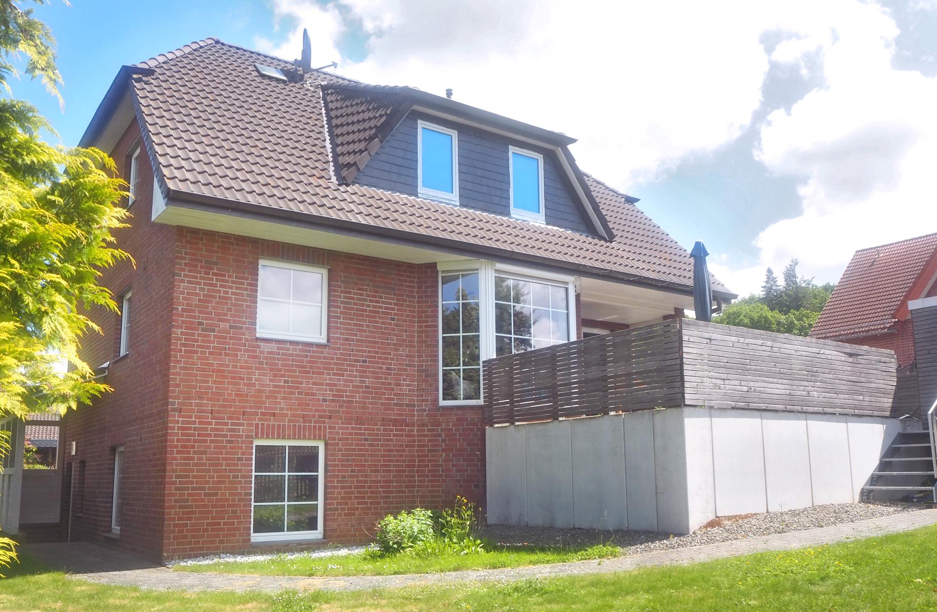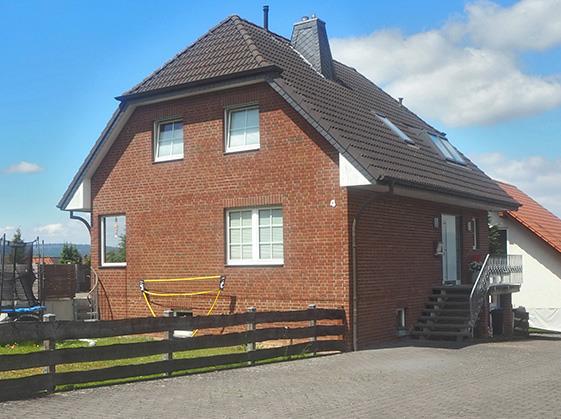 Auf einem gepflegten Grundstück mit Blick ins Grüne und in leichter Hanglage befindet sich dieses modernisierte und hochwertig ausgestattete Einfamilienhaus mit Klinker-Fassade. Sie betreten das EG über eine Außentreppe. Zu Ihrer rechten Seite befindet sich das praktische Gäste-WC sowie die großzügige Garderobe. Das EG ist lichtdurchflutet und verfügt über einen offenen Wohn- und Essbereich mit integrierter Küche. Im kompletten EG wurde hochwertiger Parkettfußboden (italienische Eiche, Echtholz) verlegt. Vom Wohnzimmer aus gelangen Sie auf die große Terrasse mit herrlichem Ausblick. Besonders der große Erker im Essbereich mit den großen Fensterelementen lässt das Haus großzügig und hell wirken. Der wasserführende Kaminofen im Wohnzimmer ist ebenfalls ein besonderer Hingucker. Über eine Echtholztreppe erreichen Sie den gemütlichen Schlafbereich mit 2 Kinderzimmern und einem Elternschlafzimmer. Das Badezimmer wurde erst vor einigen Jahren geschmackvoll und aufwendig saniert und bietet eine ebenerdige Dusche, ein Doppelwaschtisch und eine Badewanne. Der Spitzbodenbereich verfügt noch über weitere Abstellmöglichkeiten. Im Vollkeller könnte es sich auch ein Teenager gemütlich machen, da es einen separaten Eingang gibt. Hier wurde erst in diesem Jahr das Duschbad hochwertig mit großkeramischen Fliesen erneuert (alle Wasserleitungen und Badobjekte wurden in diesem Zug auch saniert) sowie der Hobbyraum und der Flur wurden mit neuem Vinylfußboden ausgelegt. Zudem gibt es abschließend einen großen Abstellraum sowie einen Heizungskeller mit Waschmaschinenanschluss und der Entkalkungsanlage. Die große Doppelgarage mit Abstellfläche rundet dieses ansprechende Haus ab. Das Objekt eignet sich ideal für eine Familie, die gerne auf dem Land lebt, aber dennoch gut angebunden sein möchte. Gerne stellen wir Ihnen bei einem Besichtigungstermin das Objekt vor!