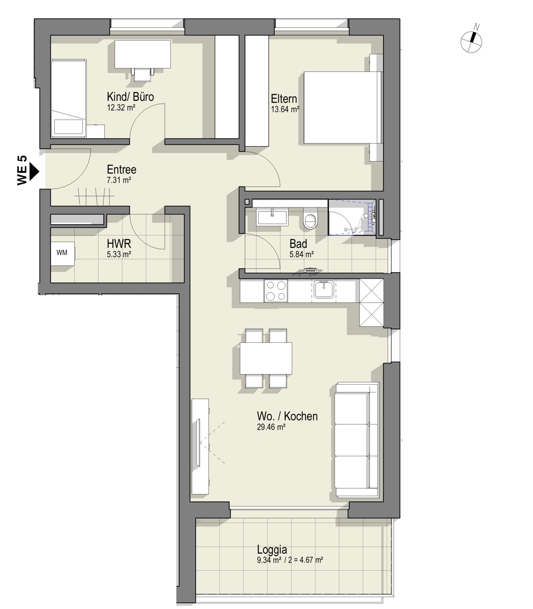 Als hintere Bebauung der Straße OSTERLAND und abgeschirmt von den tieferliegenden Bahngleisen durch eine DB eigene Lärmschutzwand am Grundstücksende entsteht eine großzügige Stadtvilla in zeitgemäßem BAUHAUS Stil mit zwei Vollgeschossen und einem Staffelgeschoss aus insgesamt 10 Wohneinheiten in massiver Bauweise. Im Zentrum des lichten Treppenhauses befindet sich ein Personenaufzug, der essenziell für die Barrierefreiheit dieses Mehrfamilienhauses ist. Die Wohnung Nr. 5 liegt im Obergeschoss links. Sie betreten die Wohnung über ein Entree mit kleiner Garderobe und direktem Zugang zu Kinder- und Elternschlafzimmer sowie Hauswirtschaftsraum. Über den angrenzenden Flur gelangen Sie links ins Tageslichtbad. Weiter geradeaus blicken Sie in den großzügig gehaltenen Wohn- und Essbereich mit offener Küche und direktem Zugang zur Loggia. Grundrisse sowie Ansichten siehe Anlage.